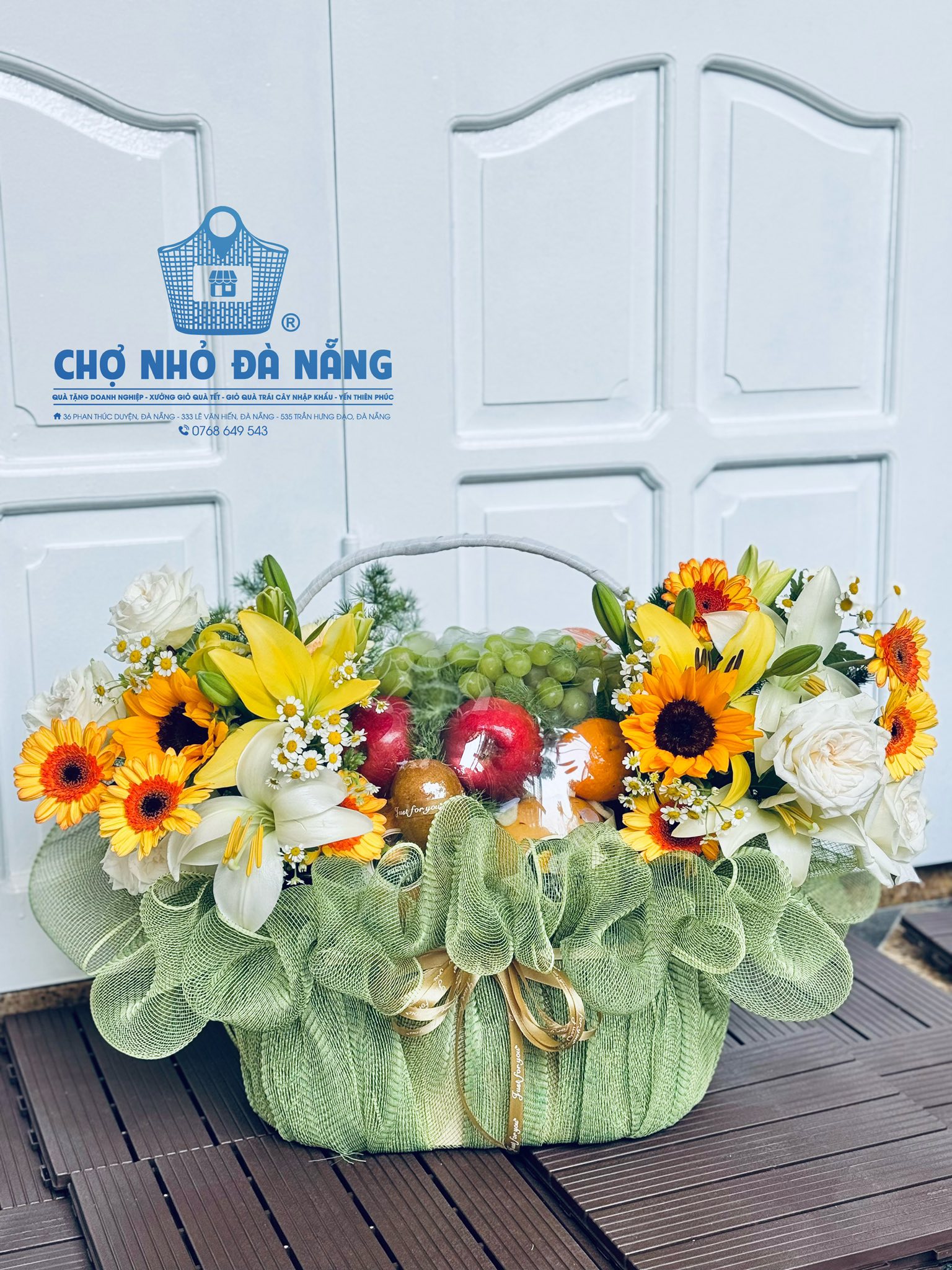 Giỏ hoa trái cây cao cấp được Ms. Ngọc – chuyên gia thiết kế nhiều năm thực hiện hơn 2000+ giỏ hoa trái cây tại Đà Nẵng phối thiết kế giỏ thẩm mỹ, thể hiện tình cảm chân thành gửi đến người nhận.