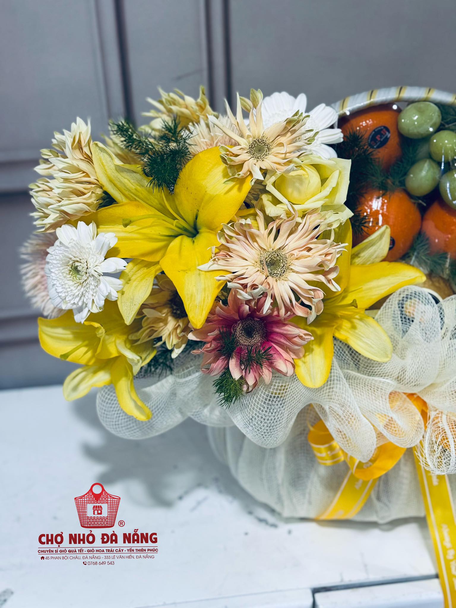 Giỏ hoa trái cây cao cấp được Ms. Ngọc – chuyên gia thiết kế nhiều năm thực hiện hơn 2000+ giỏ hoa trái cây tại Đà Nẵng phối thiết kế giỏ thẩm mỹ, thể hiện tình cảm chân thành gửi đến người nhận.