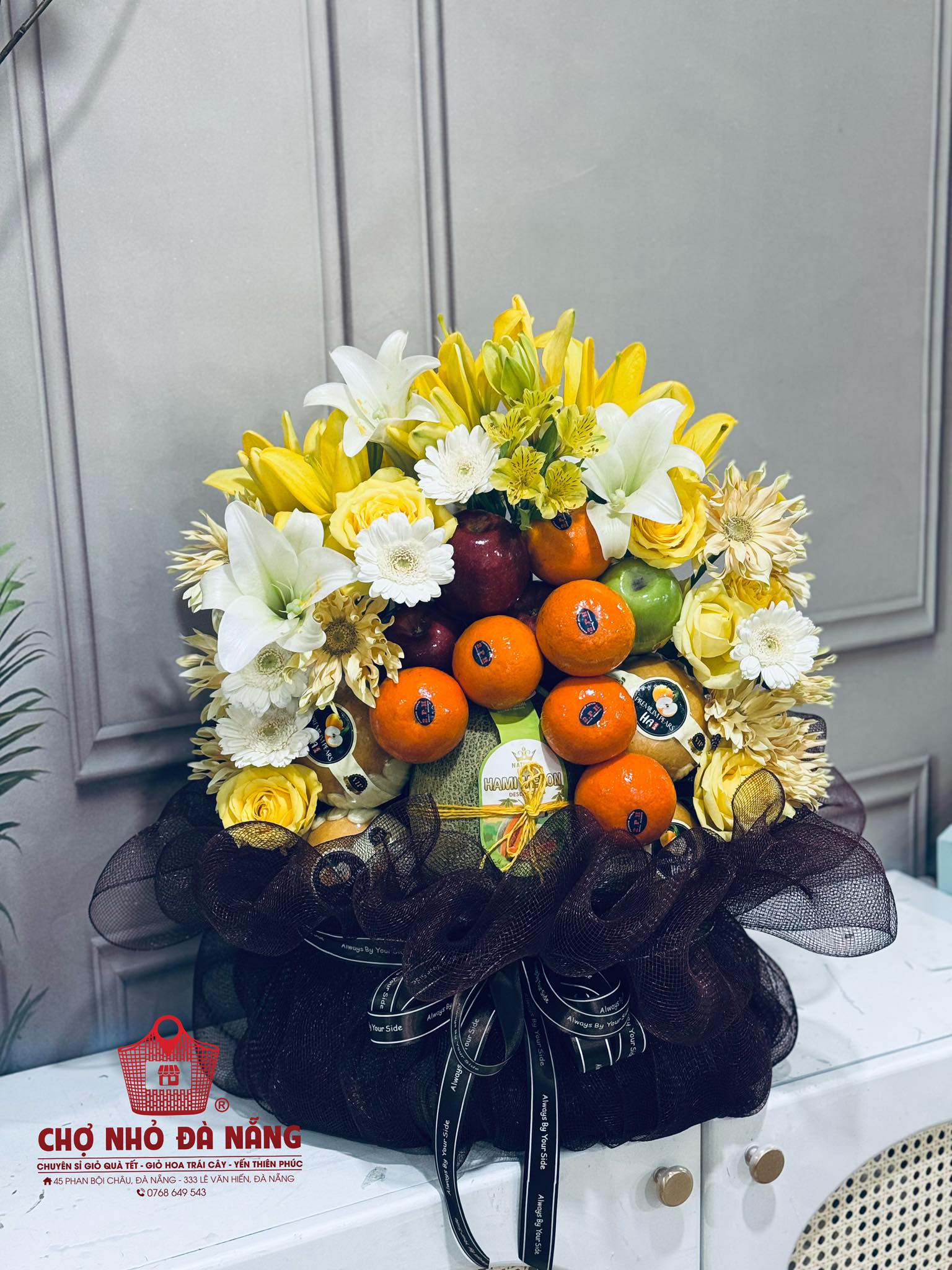Giỏ hoa trái cây cao cấp được Ms. Ngọc – chuyên gia thiết kế nhiều năm thực hiện hơn 2000+ giỏ hoa trái cây tại Đà Nẵng phối thiết kế giỏ thẩm mỹ, thể hiện tình cảm chân thành gửi đến người nhận.