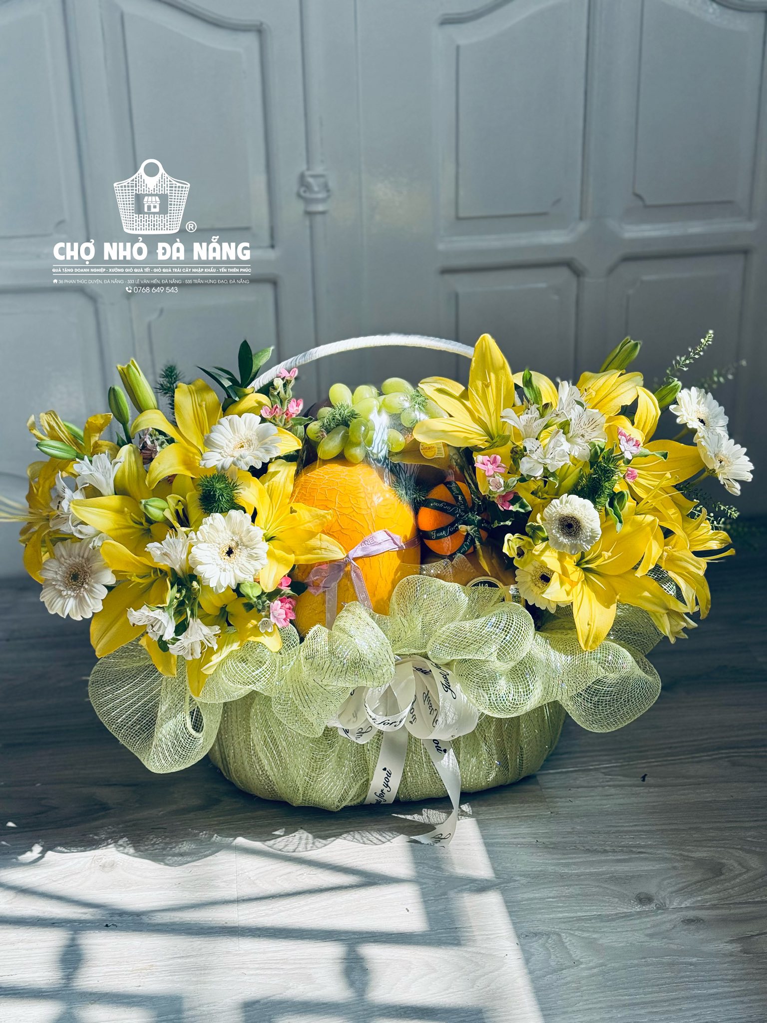 Giỏ hoa trái cây cao cấp được Ms. Ngọc – chuyên gia thiết kế nhiều năm thực hiện hơn 2000+ giỏ hoa trái cây tại Đà Nẵng phối thiết kế giỏ thẩm mỹ, thể hiện tình cảm chân thành gửi đến người nhận.